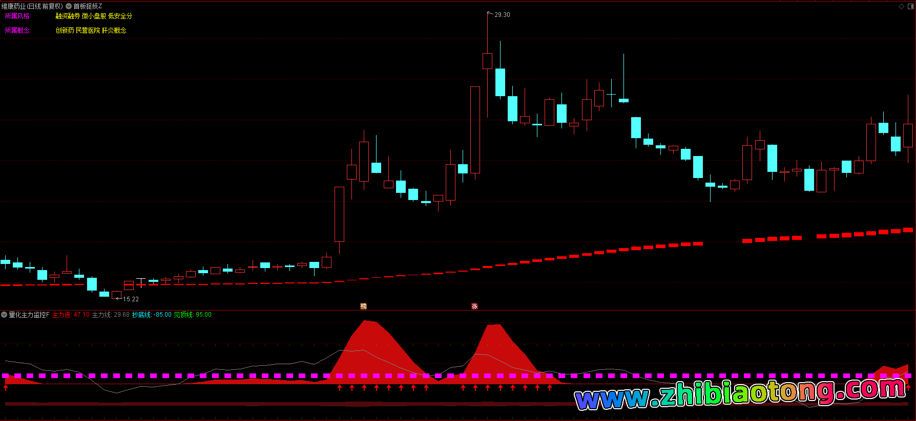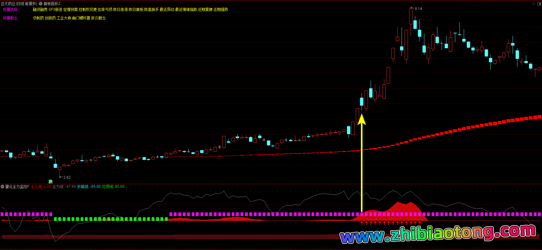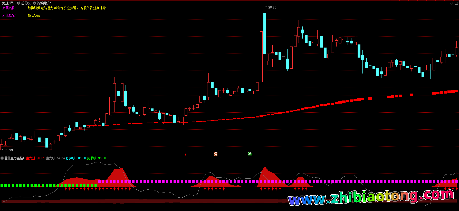 这个副图是专盯主力资金动。一是资金流向直给,红绿色带分别对应 “机买” 和 “机卖”,红带越宽说明大额资金买入越猛,绿带占优则是大额资金在流出,;二是主力进场信号明确,红色 “主力进” 红柱越长,主力进场力度越强,一旦红柱超 20,且灰色 “主力线” 在 0 轴以上,还会出 箭头,这是值得关注的进场提示;三是趋势状态一眼辨,图上的小柱子是趋势红绿灯 —— 粉色柱亮着,要么是 10 日线超 60 日线(短期强),要么是长期资金线站稳关键位(长期强);绿色柱亮着就是短期趋势偏弱,得谨慎。还有超买超卖参考:青色 “抄底线”(-85)是超跌预警,绿色 “见顶线”(95)是超买提示,主力线靠近这两条线时,就要注意涨跌反转。