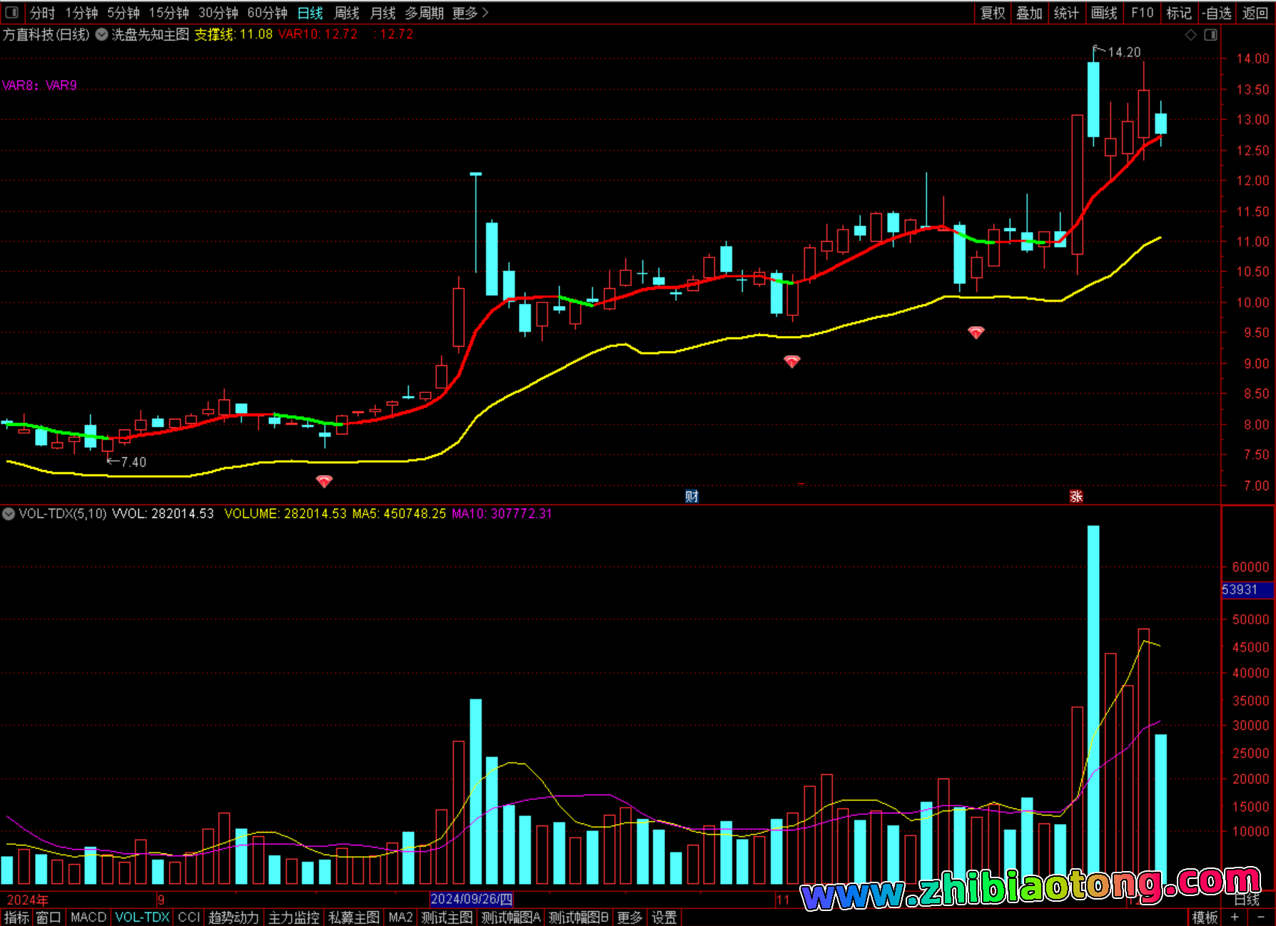 IF((VAR10<=REF(VAR10,1)),VAR10,DRAWNULL),COLORGREEN,LINETHICK3;{WWW.ZHIBIAOTONG.COM}